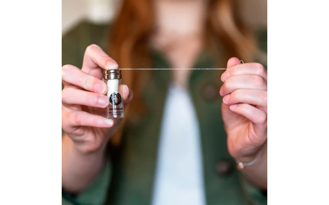 Die plastikfreie Naturzahnseide aus Maisstärke und Candelillawachs ist zu 100% vegan und die umweltfreundliche Alternative zu herkömmlichen Zahnseiden aus Kunststoffen wie Nylon. 30 m Zahnseide im praktischen und stylischen Glasflakon zum Nachfüllen. Handliche Verpackung, superleicht und kompostierbar – perfekt für den nächsten Outdoor & Camping Ausflug.