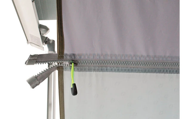 Das Outwell Fallcrest Side Panel Set wird seitlich an der Markise von Campingbussen befestigt und sorgt für Privatsphäre und zusätzlichen Schatten und Schutz vor Regen und Wind. Es wird mit einer Reißverschluss-Tasche um die Gelenkarme der Markise gezippt, dabei sorgen Abspannleinen und -punkte zuverlässig für Stabilität. Beide Wände lassen sich teilweise zusammenrollen und mit Knebeln befestigen. Auch so bieten sie noch Schutz vor den Elementen. Im Zusammenspiel mit dem Hillcrest Tarp schaffen die Seitenteile einen gut geschützten Vorraum unter der Bus-Markise. Das sehr geringe Packmaß lässt sich einfach verstauen.